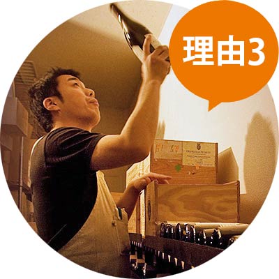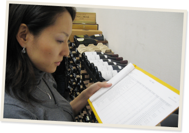 ワインがダメージを受けているか否かを見極めるには、高度な判断能力が求められます。 液面の高さやキャプセル周りの状態は勿論、最も経験が必要とされる微妙なワインの色調や澱の状態、 更には生産者の特性まで考慮に入れて検品する必要があります。 ファインワインの検品は全て熟練の担当者により行われています。 担当者が検品する本数は年間7万本以上、日本で一番多くのファインワインを手に取り、 1本1本細部に至るまで丁寧にチェックしています。同じヴィンテージの同一アイテムが複数入荷する場合、 ファインワインはボトルごとに状態が異なるので、全て1本単位で管理しています。 多大な手間と時間を要しますが、安心してファインワインを楽しんで頂く為の重要な作業なので、 担当者が責任を持って行っています。