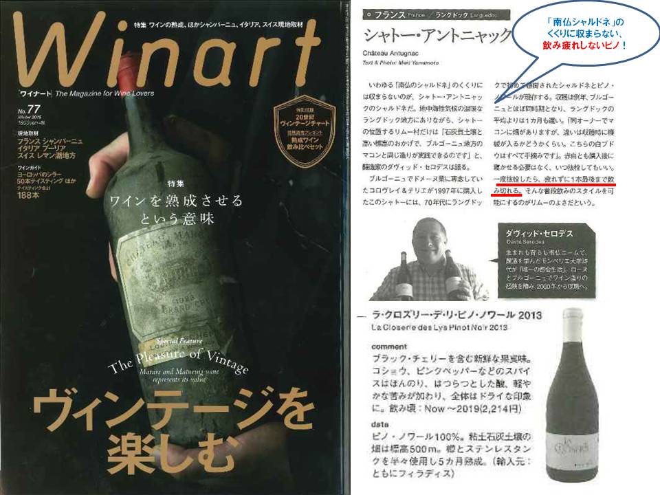 代表産地であるブルゴーニュ地方など、品質の高いものを探そうとすると必然的に価格が高いものになってしまうブドウ品種「ピノ・ノワール」、1000円台でここまでのクオリティを実現した南フランスの生産者「シャトー・アントニャック」には、頭が下がる思いです。彼らが所有するピノ・ノワールとシャルドネの畑は、ラングドック地方で最初に植樹された区画。そこから50年にもわたって創意工夫・試行錯誤を繰り返しきた彼らが、ワイン造りのロマンを追究し続ける旅の果てに見つけた、一輪の美しい百合の花・・・そんなワインだと思います。