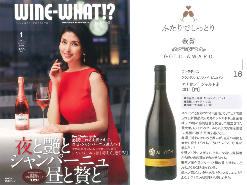 『スペイン最高のワインを造る、革新者』と評される、カリニェナ地域最大の生産者「グランデス・ビノス・イ・ビニェドス」社が、完熟したフルーツの凝縮感をテーマに造るシリーズが、『アナヨン』。果物の凝縮感をひたすら追いつつも、強く濃いだけの「飲み疲れる、飲み飽きるワイン」にはしない。シャルドネのふくよかで柔らかな味わいが優しく広がり、飲んだ後は心地よいリラックス感に包まれるはずです。普段は赤ワインしか飲まない、と言う人も、この白ワインなら絶対に満足して戴ける筈ですよ。