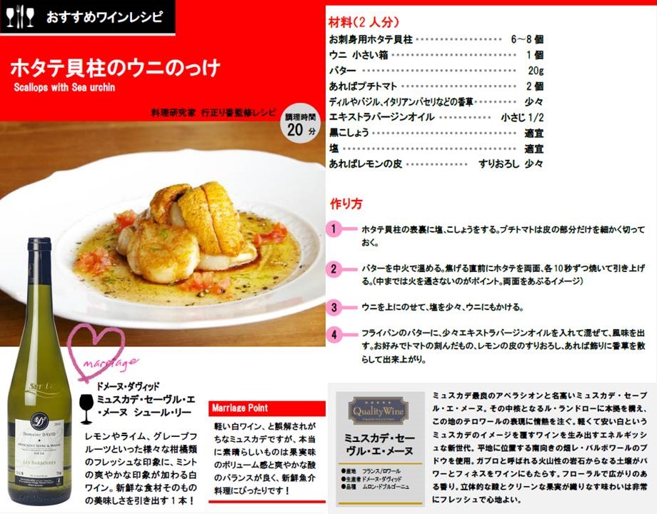 <料理家 行正り香さんオリジナルレシピ&おすすめワインのマリアージュ紹介♪第55回>帆立がおいしい時期です!そして、北海道のウニも夏前が旬!まとめて楽しむレシピをご紹介♪2017/04/16