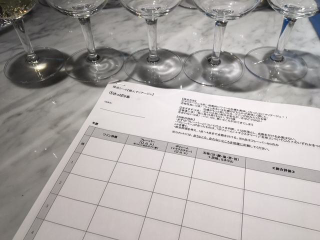ブラインド(ワインの銘柄を見ない目隠しの)テイスティングによるマリアージュ試飲。
