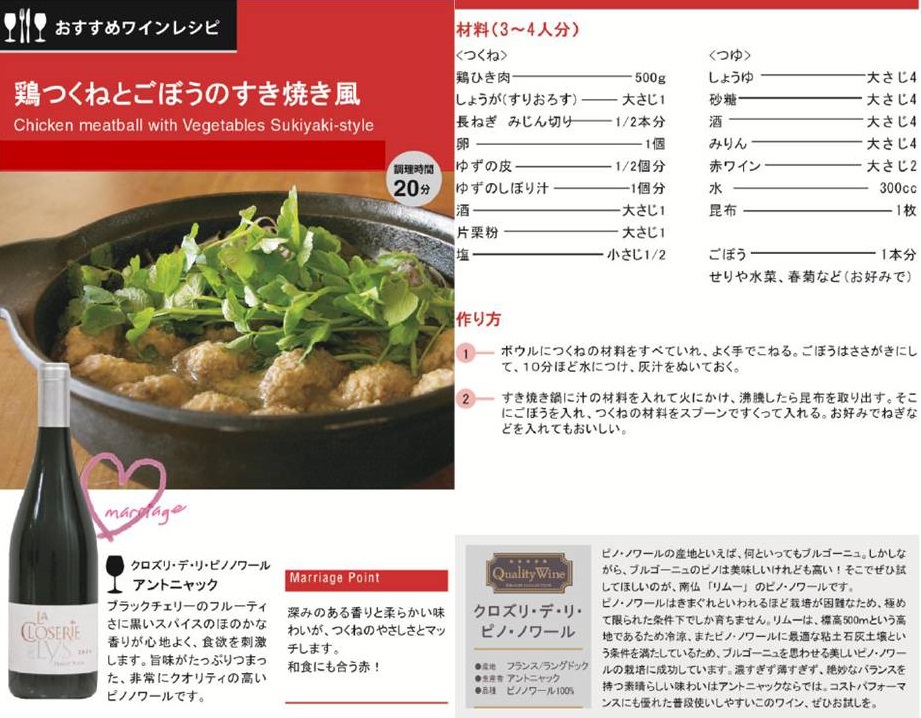 <CLUB30オリジナルレシピ100選!NO.5>ピノ・ノワール特集のレシピ第3弾、南仏ピノに美味しい鶏つくねすき焼き!2015/11/10